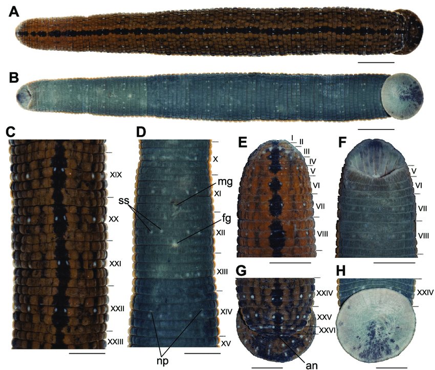 External morphology of the holotype of Hirudinaria thailandica sp. nov. in preserved state A dorsal and B ventral views of the whole body C dorsal views of somites XIX-XXIII D ventral views of somites X-XV e dorsal and F ventral views of somites I-VIII G dorsal and H ventral views of somites XXIV-XXVII and caudal sucker. Abbreviations: an, anus; fg, female gonopore; mg, male gonopore; np, nephridiopores; and ss, sensillae. Scale bar: 10 mm (A, B), 5 mm (C-H) source
